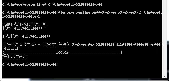 3. 复制命令: dism.exe /online /Add-Package /PackagePath:Windows6.1-KB2533623-x64.cab 这命令 直接 复制进去 鼠标对着光标右键 可以复制该命令